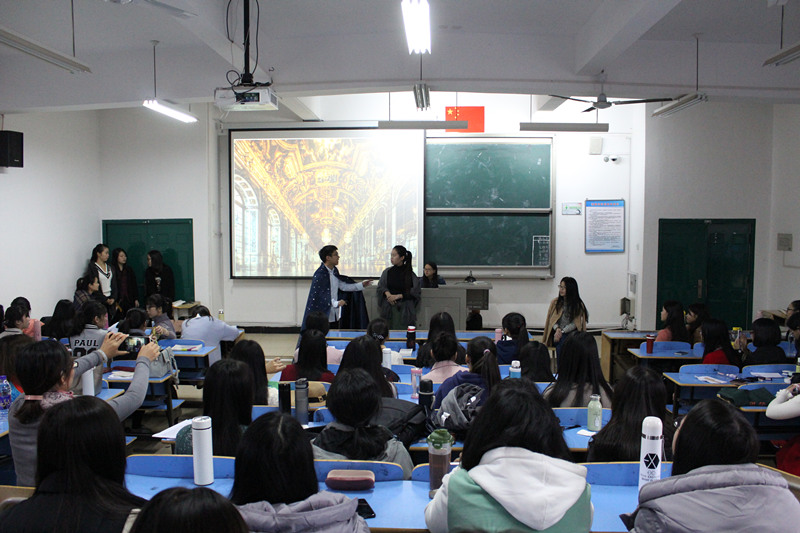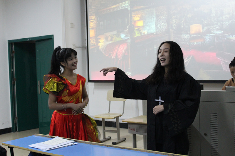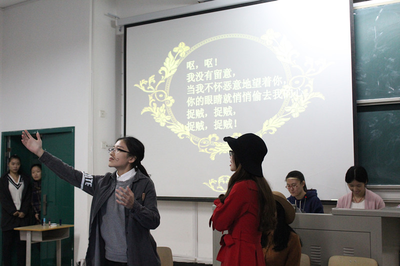 11月24日上午的第1234节课,是中文系副教授吴梅芳的《外国文学史》,她一改往日以老师讲授为主的方式,让2014级师范班和文秘班的同学演出莎士比亚的剧作《李尔王》、《麦克白》《仲夏夜之梦》等名剧片段,同学们自编自导自演,全情投入,课堂顿时热闹非凡。在同学们看来,“通过自身演绎,加深了对文学作品的理解,知识的掌握也因此变得更加牢固”。