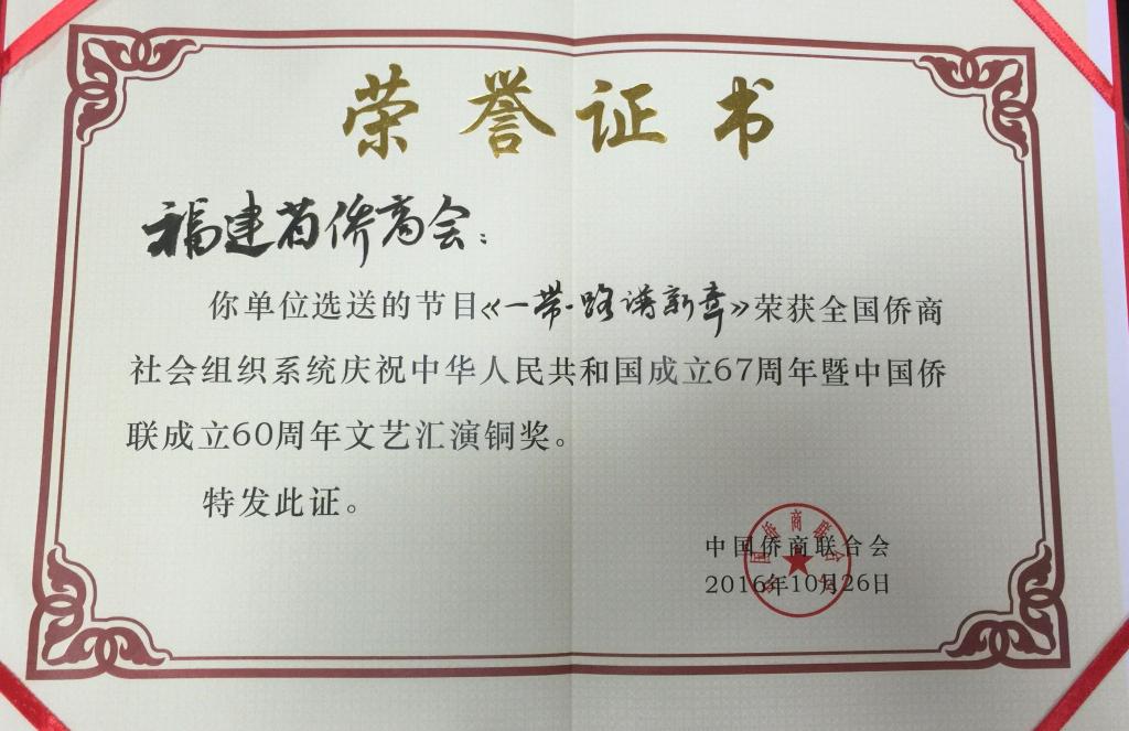 “中国政府来谋划,‘一带一路’成体系。祖国强盛我光彩,祖国发展我得益。‘ 一带一路’显神威,国歌响唱新世纪”。节目获得现场阵阵掌声。经全国30个专业评委和各参演省侨商会代表组成的评委团评选,获得铜奖以及“优秀组织奖”。